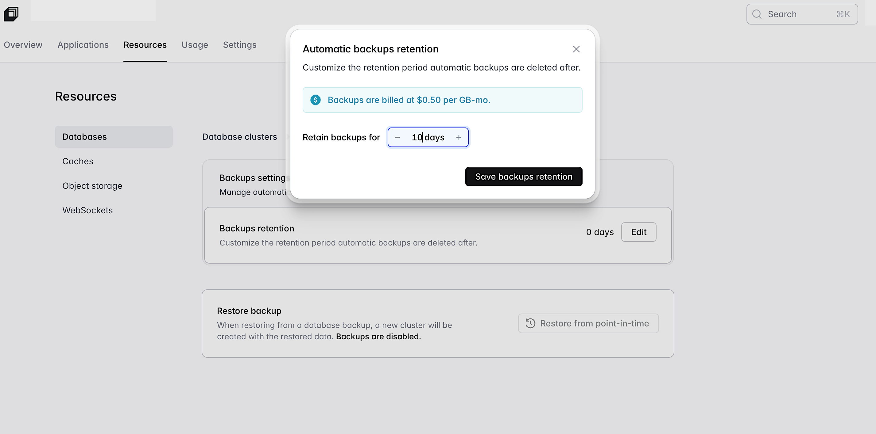 To set up your retention window, go to Resources → Databases → Select database → Backups and choose the retention period that fits your workload.
