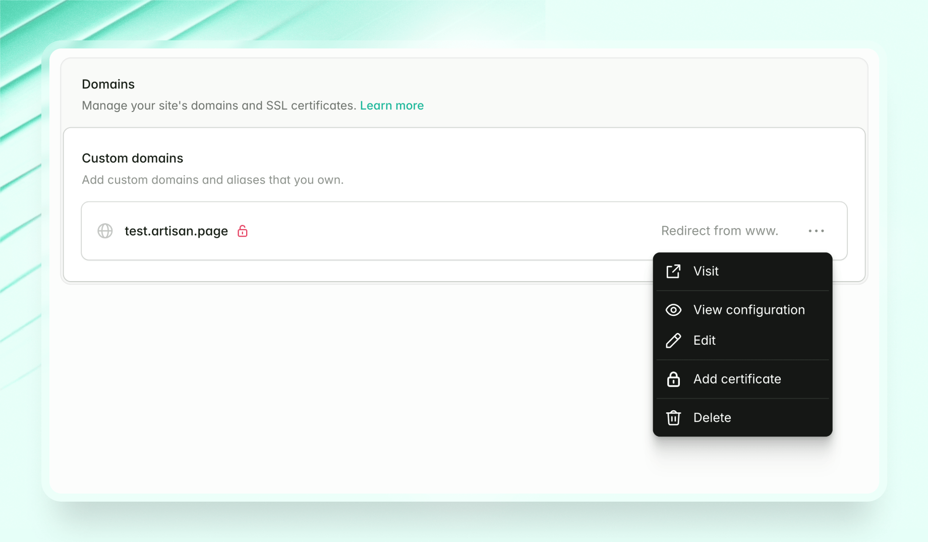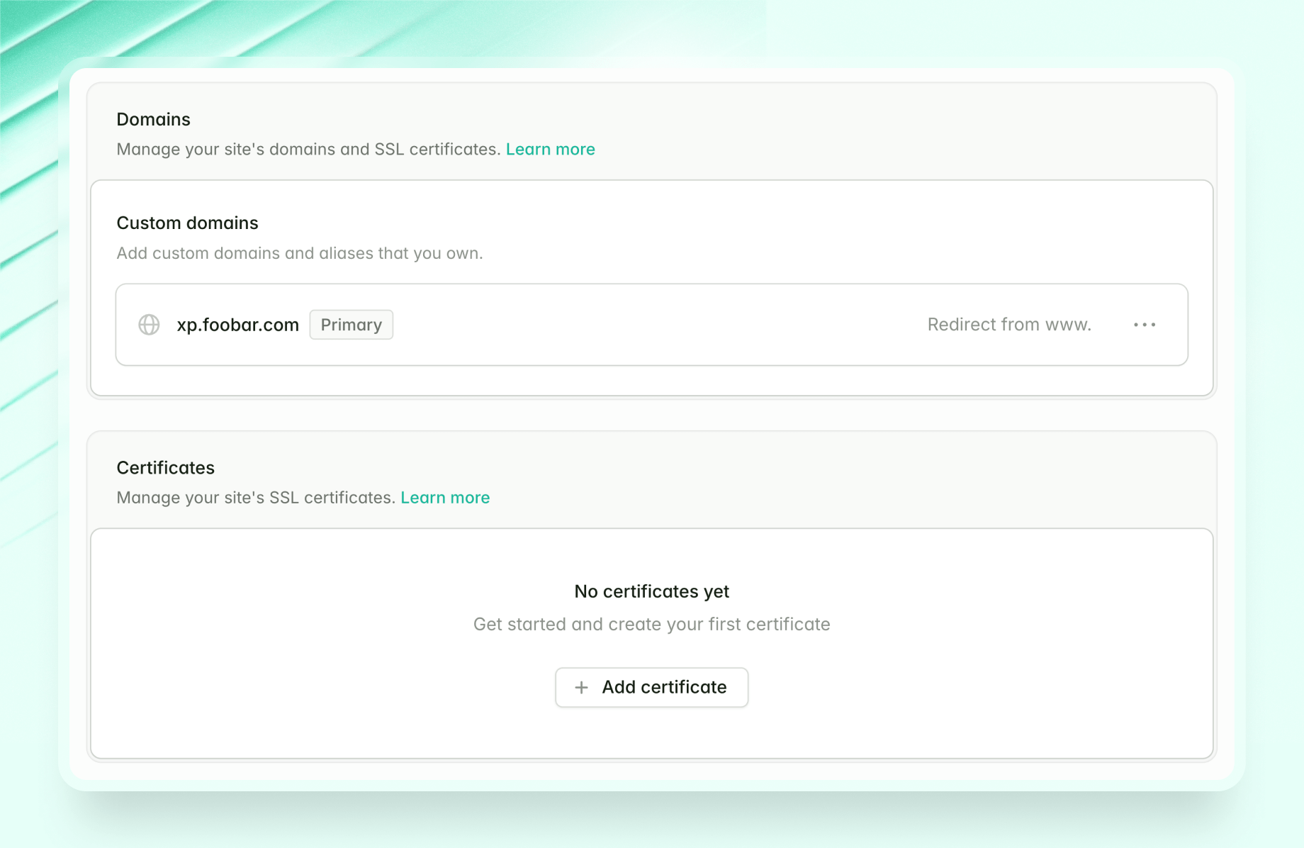 - Each domain gets its own certificate. Just hit the three-dotted menu on the right and click “Add certificate.”