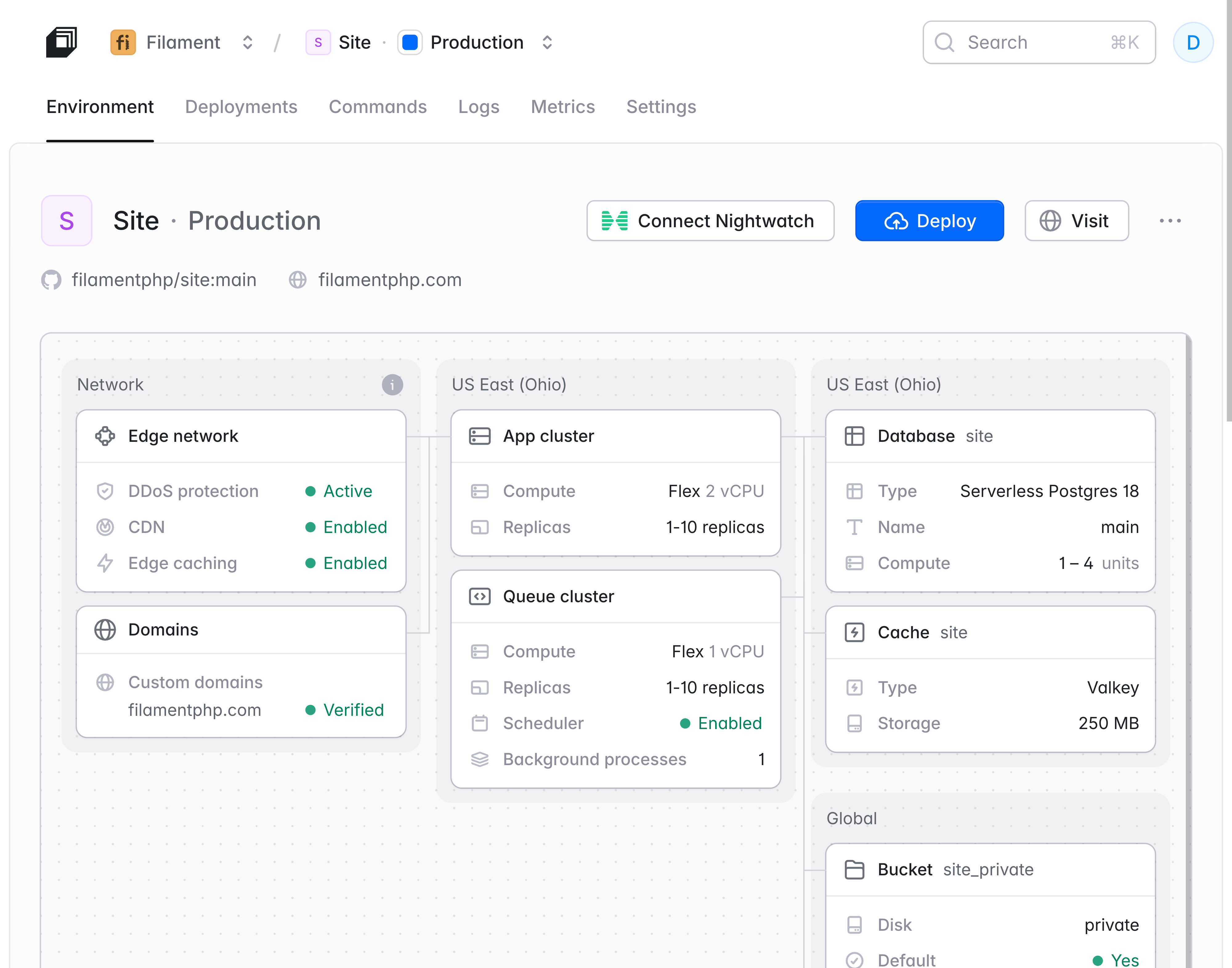 Filament had been running on Laravel Forge since the beginning. Dan was familiar with the setup and comfortable managing it. But every major release or website update brings a flood of visitors to the site. Everyone shows up at once to check out the new documentation and features, and the server needs to handle it.