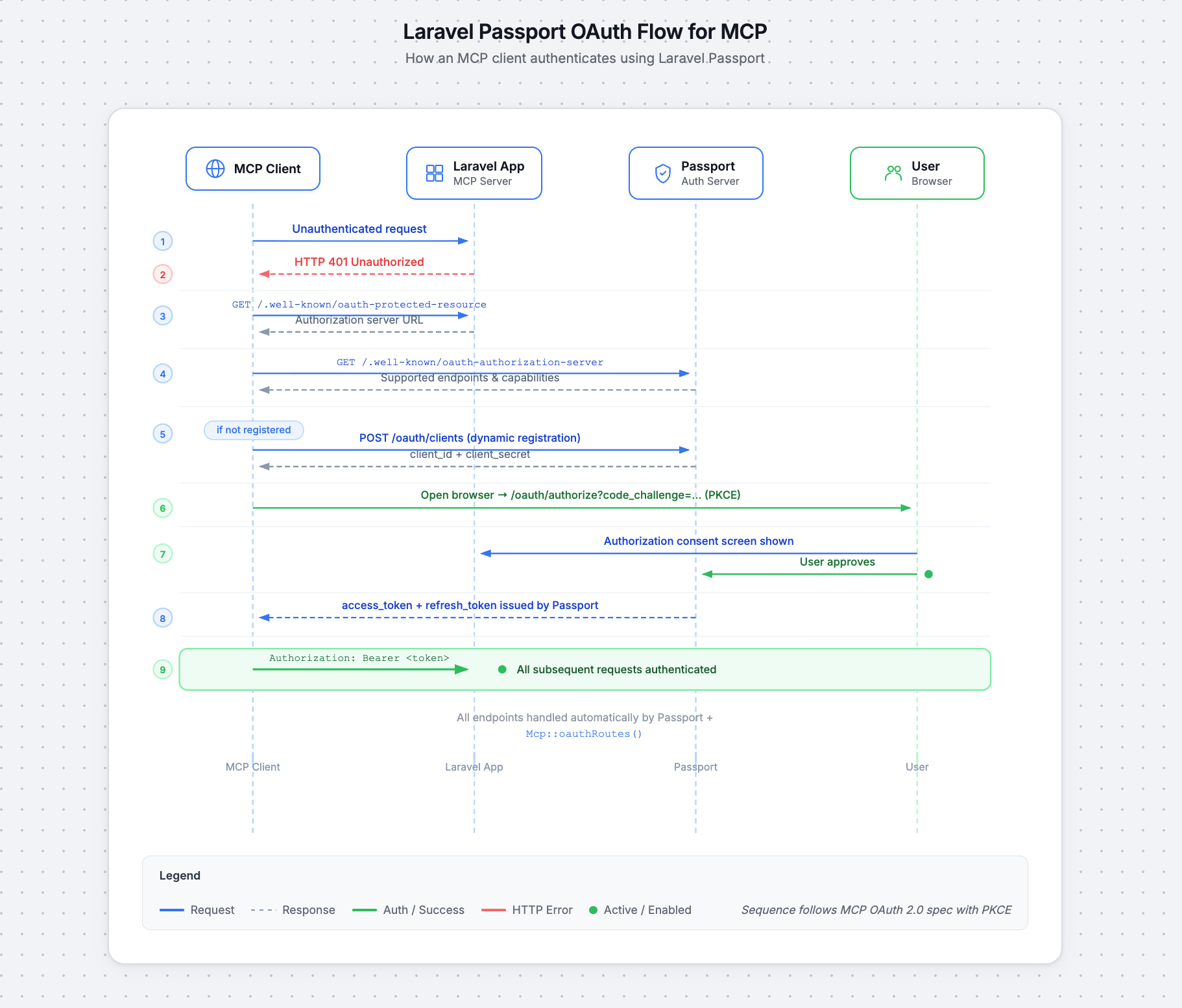 All of this is handled by Passport and the Mcp::oauthRoutes() registration. You do not implement any of these endpoints yourself.
