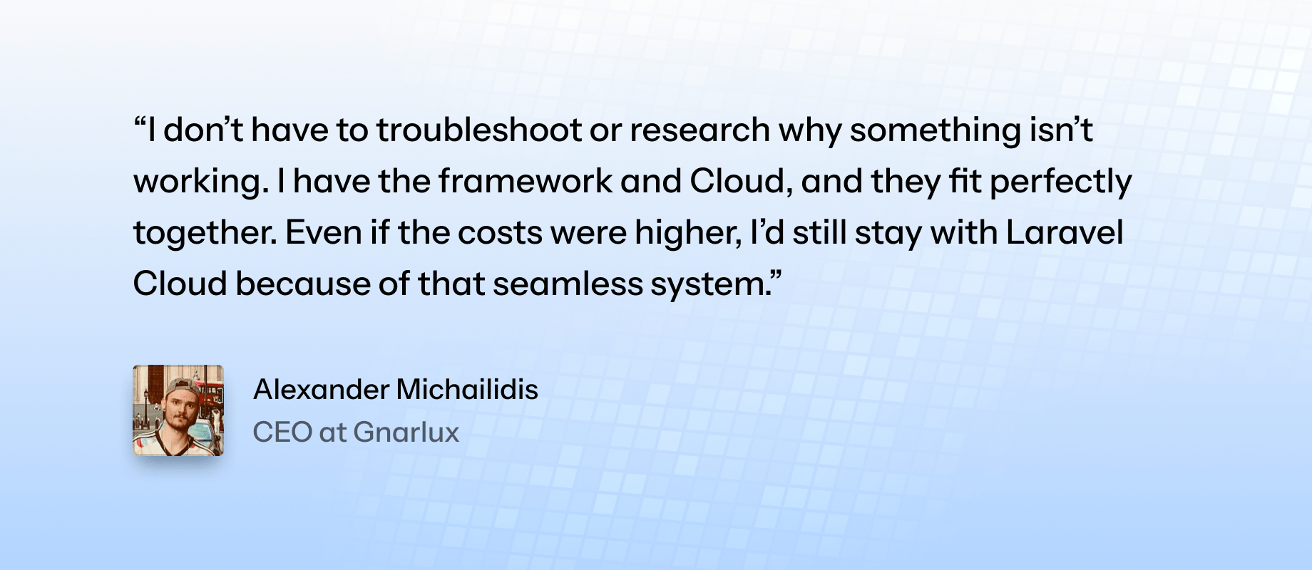 “I don’t have to troubleshoot or research why something isn’t working. I have the framework and Cloud, and they fit perfectly together. Even if the costs were higher, I’d still stay with Laravel Cloud because of that seamless system.”