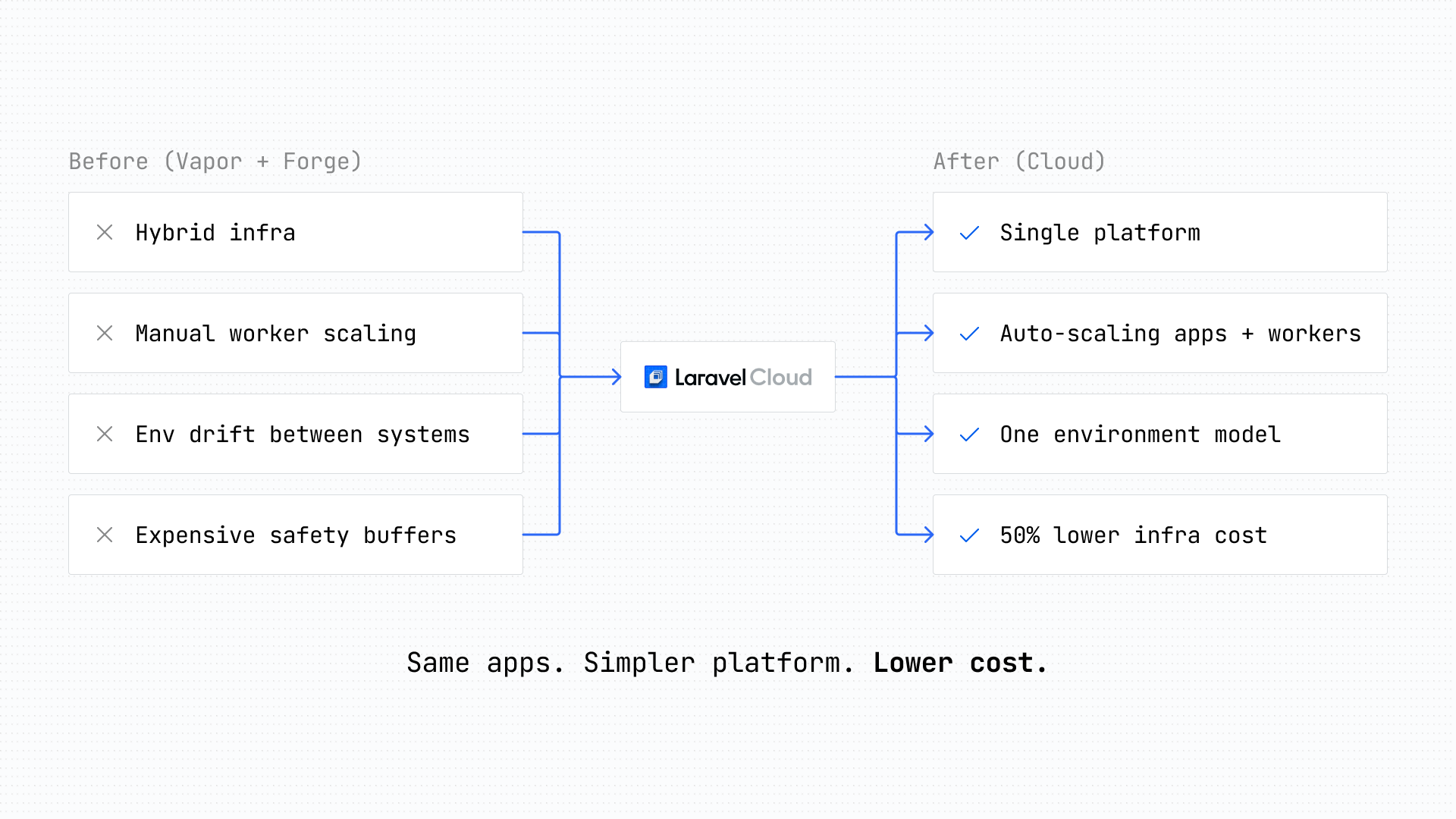 He also admitted that he wishes they had migrated sooner. ”If I could do something differently, I would have left Vapor earlier, just because of cost. Our infrastructure costs on Laravel Cloud are more than 50% lower.”